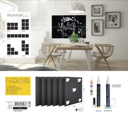XXL-Wandkreidetafel mit präzise geformten, flexiblen und einfach zu reinigenden Platten. UV-, Stoß-, Schmutz- und kratzbeständigeSchreiboberfläche.Verpackt a 6 Stück je 40x40cm. Das erstellen von beliebig großen Kreidetafeln wird so möglich. Ohne Kreidemarker.